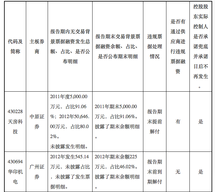 随机通过网络检索挂牌股票代码和简称的方式,对430690-830792的挂牌公司是否发生无交易背景的票据融资情况进行检索,检索到5个案例,同时增加天津本地的挂牌公司天房科技案例。总结情况见下表:
