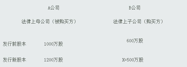 解析:反向购买中,形式上是A公司发行1200万新股购买了B公司600万存量股,其效果也可以认为是B公司发行了X万新股购买了A公司1000万存量股,根据简单的比例换算可以得出X=500。