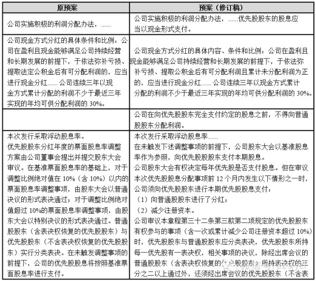 修改后的预案规定公司股东大会有权决定每年优先股是否支付股息,将强制付息义务改为“在未触发下述调整事项的前提下,公司股东大会以基准股息率作为参照,向优先股股股东支付本期股息”,即没有强制付息义务;且无强制性可赎回条款,而是公司有权选择赎回。