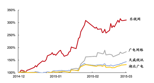 图 27: 乐视网及广电系上市公司2014年底来股价相对表现