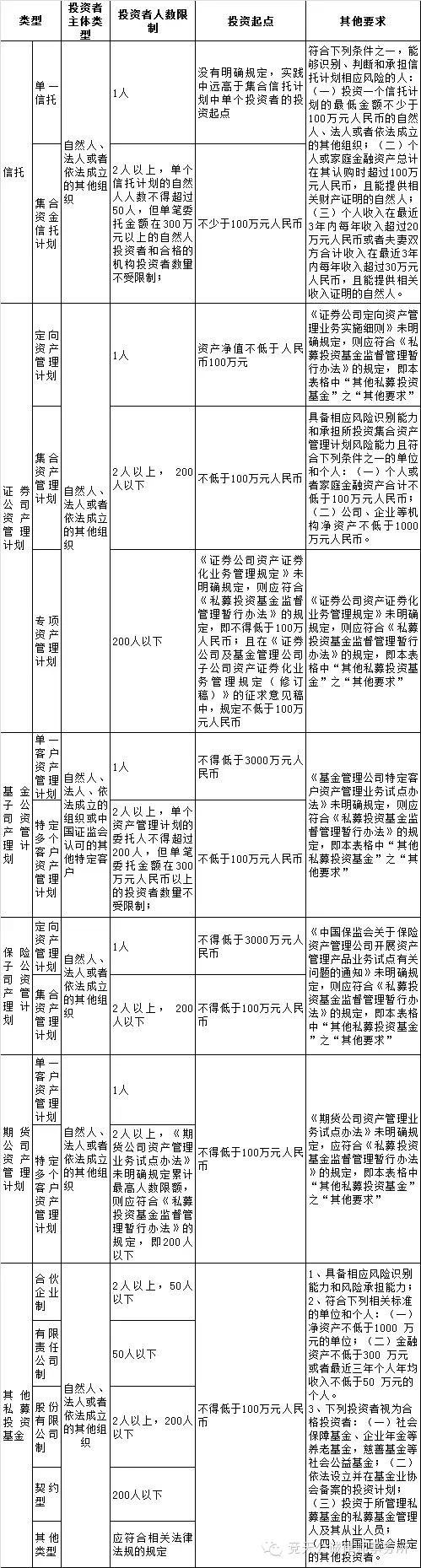 而现实是,为了提高投资者对投资私募投资基金风险的财务承受能力,将不具备风险承受能力的投资者拒之门外,银监会、证监会、保险会分别对各类私募投资基金制定了“合格投资者”制度,只有满足合格投资者条件的投资者才有资格认购、受让私募投资基金份额。下表为各类私募投资基金“合格投资者”的具体要求: