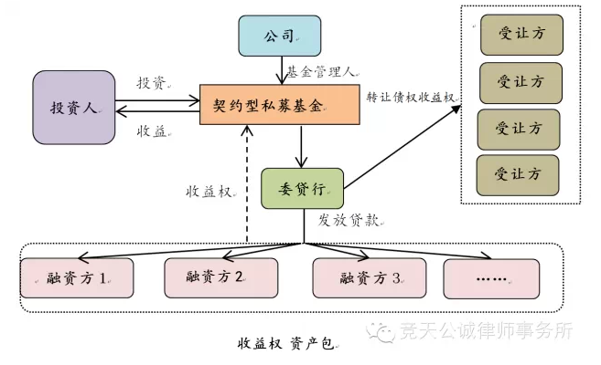 笔者认为,债权以及以债权为基础资产的债权收益权对外拆分转让不存在转让金额起点、受让人人数方面的法律限制。因此,笔者建议在投资者主体资格、投资额及投资者总人数无法满足私募投资基金相关监管规定且在某一交易架构下同时存在债权和私募投资基金份额收益权的情况下,应优先选择拆分债权/债权收益权而非私募投资基金份额收益权。以下图所述交易架构为例,某公司作为基金管理人发起设立契约型私募投资基金,基金管理人将私募投资基金募集资金委托商业银行向融资方发放委托贷款:
