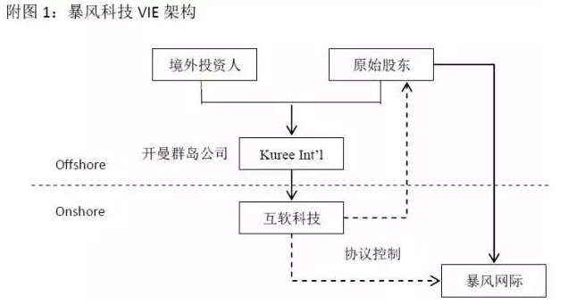 如本文之前提到,VIE结构并不对境内实际运营实体的股权结构造成影响,而是通过协议关系绑定境内运营实体的控制权和利润。因此,VIE回归中的核心并不在于实际运营实体的境内架构重整,而是对实施控制的境外架构直至WFOE的整体拆除。实践中,VIE模式中多有美元基金的介入,在境外结构拆除时,这些美元基金退路的设计是至关重要的环节。以目前最受市场关注的暴风科技为例,其VIE设立时的结构如下图所示: