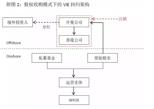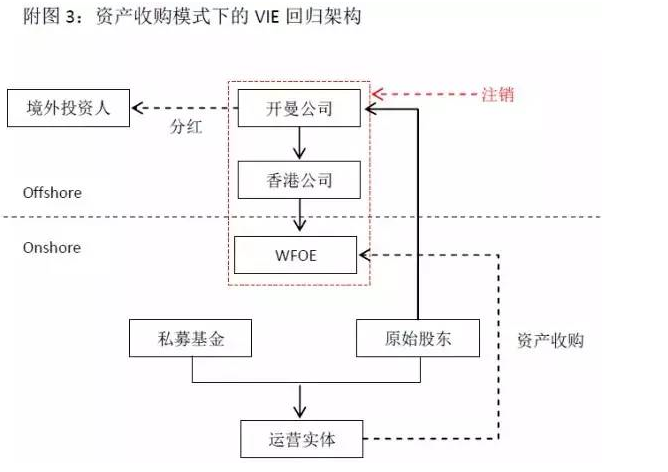 在资产收购模式下,私募基金单方或者联合原始股东向境内的运营实体增资;境内运营实体取得资金后向WFOE购买资产;WFOE通过分红或清算等方式将资金通过香港公司逐级支付至开曼公司,并最终用于向境外投资人支付回购价款。通过资产收购模式完成VIE回归后形成的境内外架构如下:
