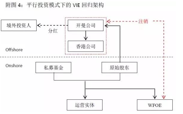在平行投资模式下,人民币私募基金以较低对价向境内运营实体增资或受让其股权,同时,人民币私募基金以剩余资金联合原始股东直接向香港公司收购其持有的WFOE全部股权;香港公司将其收到的股权转让对价以分红方式分配至开曼公司,并最终用于向境外投资人支付回购价款,暴风科技采用的就是这个模式。通过平行投资模式完成VIE回归后形成的境内外架构如下: