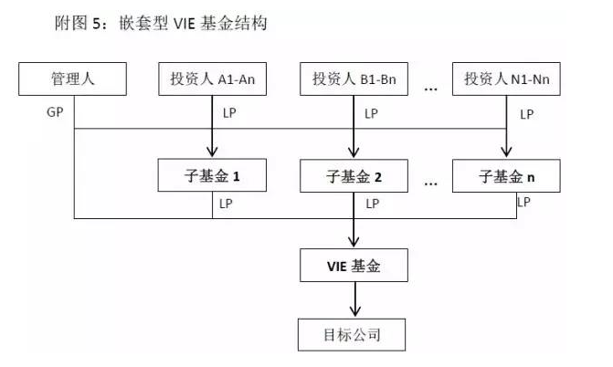 截至目前,基于境内上市时股东主体资格要求以及税负成本等考虑,VIE基金仍多采取有限合伙形式组建。而受限于有限合伙企业中有限合伙人不超过49人的限制且须兼顾较高的募资要求,VIE基金多采取如下的嵌套方式设立: