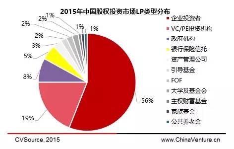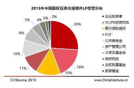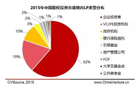 在境内LP群体中,企业投资者占比达62%,高于境外LP群体中企业投资者占比;排名第二位的是VC/PE投资机构,占比达19%;其后为政府机构,占比达10%。境内LP类型分布情况与2014年相比,VC/PE机构占比下降3个百分点,政府机构占比上升1个百分点,企业投资者依旧占据了大半的比例,而养老金、家族基金、保险、捐助基金等欧美市场成熟的机构投资者,在本土LP市场中占比依然较低,难成主流。