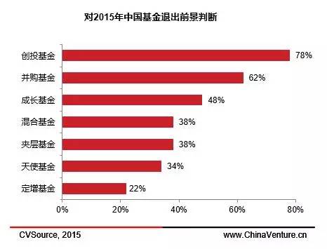 调研结果预测,创业投资基金、成长基金仍是2015年中国最具退出前景的基金。投中研究院认为,传统Pre-IPO投资模式面临退出困难的重压导致投资阶段的前移,市场投资机构普遍倾向于将资金投向早期与发展期基金从而提前揽入优质项目来取得丰厚的回报。另外,并购市场异军突起,投中研究院认为造成并购市场的火热升温原因有两个方面:一,传统行业通过并购实现转型升级,新兴行业则通过并购掌握最新的技术、产业动态、实现产业链的完整布局。二,近年来二级市场的繁荣发展使得上市公司估值处于高位,通过并购可享一二级市场估值差套利。