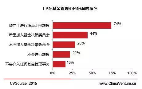 对于LP在基金中所扮演的角色,据调研数据进行推测, 74%的投资人倾向于进行适当比例的跟投,这一比例与2014年(71%)相比略有上升,其跟投的积极性增加。说明LP在做为出资人的同时,希望GP提供更多的跟投机会,直接参与到投资当中。