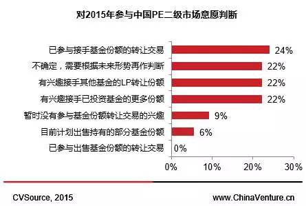 据调研数据可看出,约两成的受访LP有兴趣接手已投资基金或其他基金的LP转让的更多份额,并且没有任何受访LP“已参与出售基金份额的转让交易”。投中研究院分析认为,目前实际参与PE基金二级市场交易的LP仍占少数。由于基金份额估值定价困难、市场信息流通不顺、GP积极性不高等因素,导致了PE基金二级市场参与意愿普遍偏低这一现象。