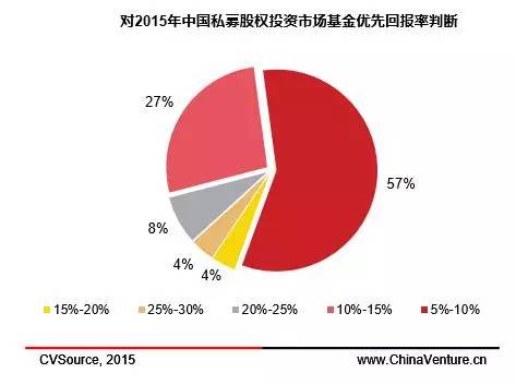 对于2015年中国私募股权投资市场基金优先回报率,各LP均持有不同观点,呈多元趋势。倾向回报率为5%-10%的LP占总数一半以上(57%);倾向10%-15%回报率的LP占总约27%。对于基金的优先回报率的倾向不同体现出了LP对于股权投资市场收益预期的不同,以及投资于债券类或股权类标的的偏好不同。