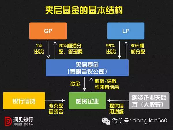 夹层基金的组织结构一般采用有限合伙制,有一个一般合伙人(GP)作为基金管理者,提供1%的资金,但需承担无限责任。其余资金提供者为有限合伙人(LP),提供99%的资金,但只需承担所提供资金份额内的有限责任。基金收益的20%分配给基金管理者,其余80%分配给有限合伙人。