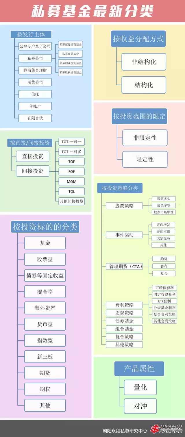 随着行业的不断发展壮大,新产品的不断涌现,私募产品的分类也将极为复杂,分类体系也应该随着行业的发展而变化。而且目前行业内对基金分类规则没有统一的标准,而且分类较为凌乱。为此,朝阳永续基于自身强大的私募数据库,以及对私募行业的跟踪研究,对国内私募基金按七种基础口径进行分类,几乎能覆盖市场所有产品,能满足大部分投资者需求。尤其对投资策略、投资标的等针对市场的应用型分类进行细化,以方便各维度的产品分类处理和统计。朝阳永续也将对其进行细化、完善并修正,以保证其科学性及合理性。
