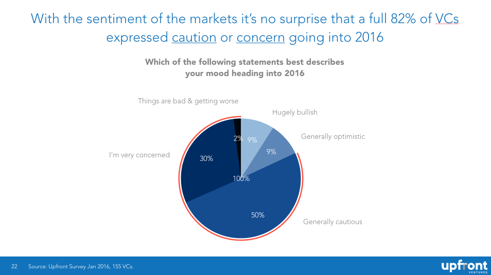 我最近调查了超过 150 位 VC 朋友,这些人涵括了不同投资阶段和不同的地理位置,关于最近的市场,我提出的问题是 “下述陈述哪一个最好地表述了你对步入 2016年 的情绪?” 从下表可看出,谨慎与乐观的对比是 82%:18%。