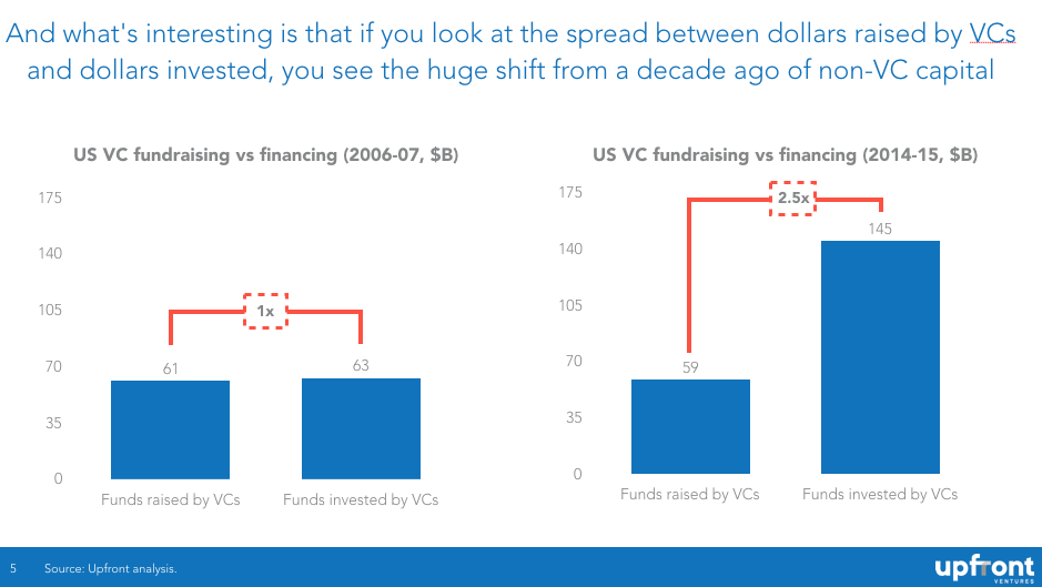 最近价格的暴涨绝大部分都是被共同基金、避险基金、企业投资者等非传统 VC 推动的。从下表中你还可以看出,10年 前初创企业的钱基本全都是 VC 给的,但 10年 后 VC 融资额仅占初创企业融资额的 40%。