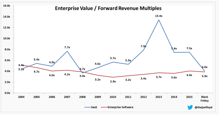 正如我前面指出那样,Joe Floyd 非常出色地通过 SaaS 乘数变化情况捕捉到了这一点(注:Mahesh Vellanki 还分析了更多行业的收入乘数情况)。上图可以看到,2007年 的时候大家愿意给 SaaS 业 7.7 倍的预期收入乘数,而上一年还不到 5 倍。这种背离到 2013年 达到了 13.4 倍的高点,然后又恢复到 4 倍的水平—略低于历史中值。