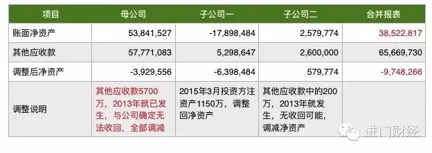 这是今年9月尽调的一个公司,他通过其他应收款去虚增的。这个公司有两个子公司,合并的报表账面的净资产大概是3800万多,但是后来发现其他应收款是6500万多,整个其他应收款都是虚增的,核算后这个公司净资产是-900w。