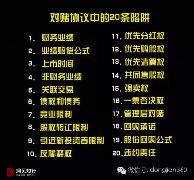 关于“上市时间”的约定即赌的是被投公司在约定时间内能否上市。“上市时间”的约定一般是股份回购的约定,“比如约定好两到三年上市,如果不能上市,就回购我的股份,或者赔一笔钱,通常以回购的方式。但现在对这种方式大家都比较谨慎了,因为通常不是公司大股东能决定的。”