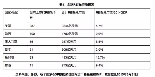 自1960年在美国出现以来,REITs产品在过去几十年中获得了迅猛发展,在海外发达经济体中,REITs已在各自的股市市值和整体资本市场中占有重要地位。据彭博统计目前,全球有30多个国家和地区推出了REITs产品,其规模已经从1990年的89亿美元增加到2015年3月底的1.8万亿美元,发展速度可谓惊人。