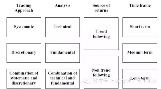 根据交易方法,可以分为主观交易和系统化交易;根据分析方法,可以分为基本面分析和技术面分析;根据收益来源,可以分为趋势追踪和非趋势追踪;根据时间窗,可以分为短期、中期和长期。