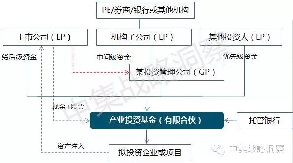 基金结构:上市公司出资作为基金的劣后级,投资机构出资作为夹层(或中间级),并由投资机构负责募集优先级资金