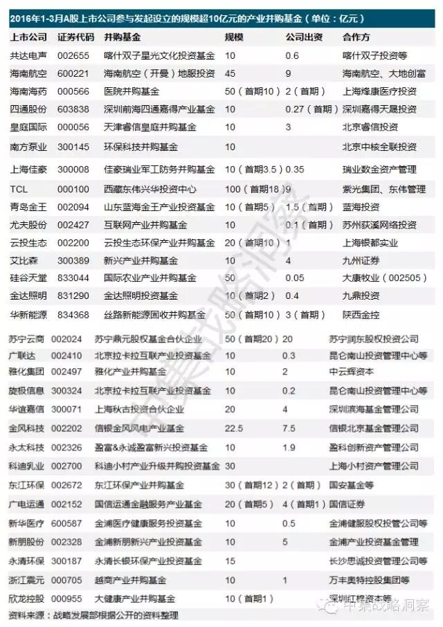 2016年1-3月,共有83家A股上市公司发布成立并购基金的公告,其中规模超10亿元的30家,总规模超过400亿元