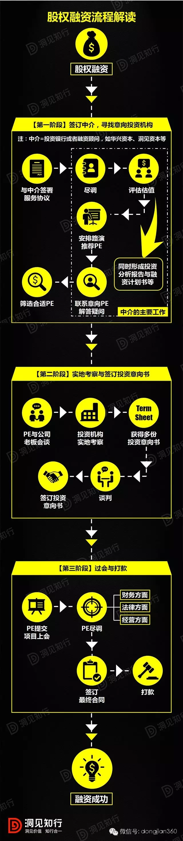 股权融资的过程大致可以归纳为3个阶段:1、签订中介(也就是投资银行或融资顾问),寻找意向投资机构;2、实地考察,签订意向投资协议书;3、过会与打款。